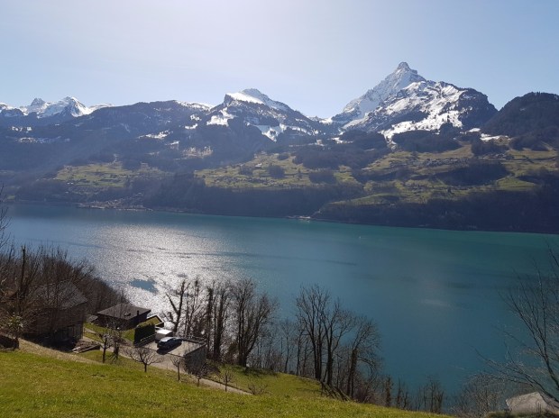 When we reached the end of the road, however, our timing was perfect. Just the right amount of time for a stroll up to the falls and back before lunch! The Waterfalls were pretty cool – I was impressed by how close you could get. And the day was just magnificent. Green, green grass with its first smattering of spring blossoms, snowcapped mountains, the jade lake, blue skies with barely a cloud. Simply stunning. This is Heidiland (it actually is). And, to stick a bunch of metaphors in the blender, my little girl’s heart was alive with the Sound of Music.